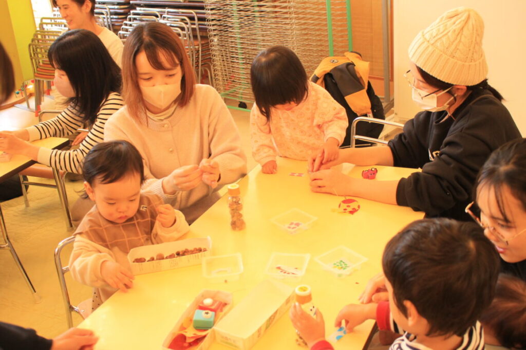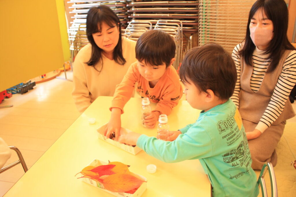 11月27日(木)10時~園内で11月の予約園庭開放がありました。今月は「自然物で楽器を作ろう!」で、8組の方が参加されました。