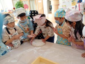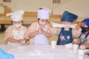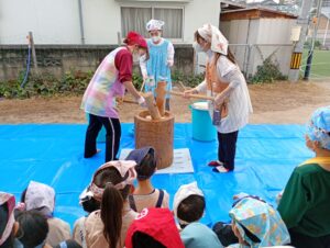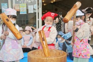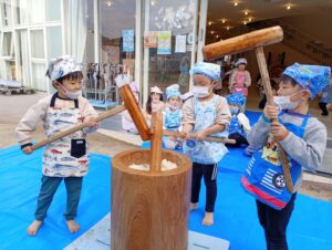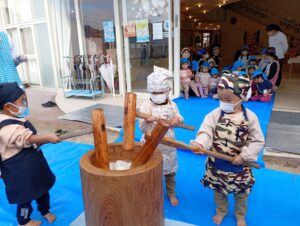 昔ながらの餅つきを通して、」子どもたちは日本の伝統文化に触れ、力を合わせる大切さや食べ物への感謝の気持ちを学ぶことが出来ました。友だちや先生と一緒に笑顔で体験したこの時間が子どもたちの心にあたたかい思い出として残ってくれることを願っています。
