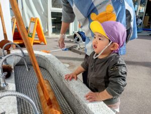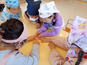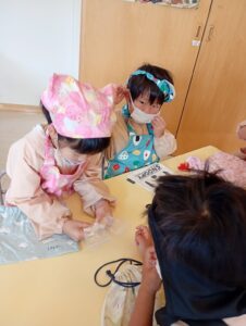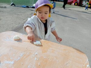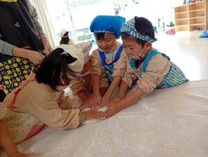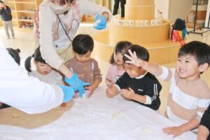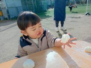 1歳児クラスのおともだちは、おもちを触るとムニムニして気持ち良かったのか、怖がることもなく、楽しんでいました。