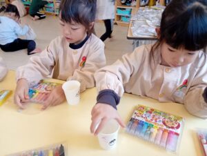餅つきを待っているクラスでは、お米ともち米の違いは何か、調べてみたり、持って帰る用の紙コップに可愛い絵を描くなどして待っていました。