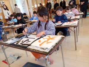 1月20日(火)に年長組さんの書道参観がありました。春から初めたお習字にも少しずつ慣れ、秋に行われた運動会での書道パフォーマンスはお客さんの前で堂々と大きな筆で書く姿は圧巻でした。こうして色々な経験を積んできたお習字を今日お家の方に見てもらえると、子ども達はとても楽しみにしていました。