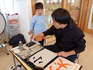 次はお家の方にも同じように挑戦して頂きました。お家の方が真剣に習字に取り組んでる姿は中々普段見ることが出来ないので、子どもたちは尊敬の眼差しです。✨✨