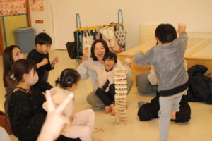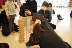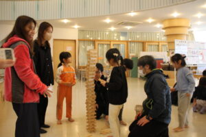 随分高く積み上げたチームもいましたよ。折角高く積み上げたのに、倒れてもう一回みんなで協力して積み上げる場面も💦。