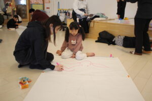 そしていよいよお家の方と一緒に作る等身大。大きな模造紙を体の大きさに合わせてつなげ、子ども達は模造紙にゴロン(笑)好きなポーズを取り、お家の方に鉛筆でかたどってもらいました。それが出来ると・・・・