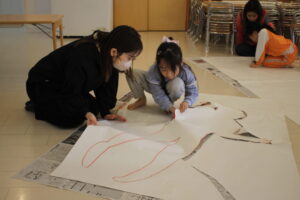 そしてもうひとつのお楽しみは、書道の時間とは別にホールでお家の方と一緒に触れ合い、ゲームをしたり、自分達の等身大を作成するなどのお楽しみの時間です。