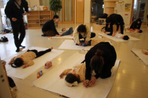 そしていよいよお家の方と一緒に作る等身大。大きな模造紙を体の大きさに合わせてつなげ、子ども達は模造紙にゴロン(笑)好きなポーズを取り、お家の方に鉛筆でかたどってもらいました。それが出来ると・・・・