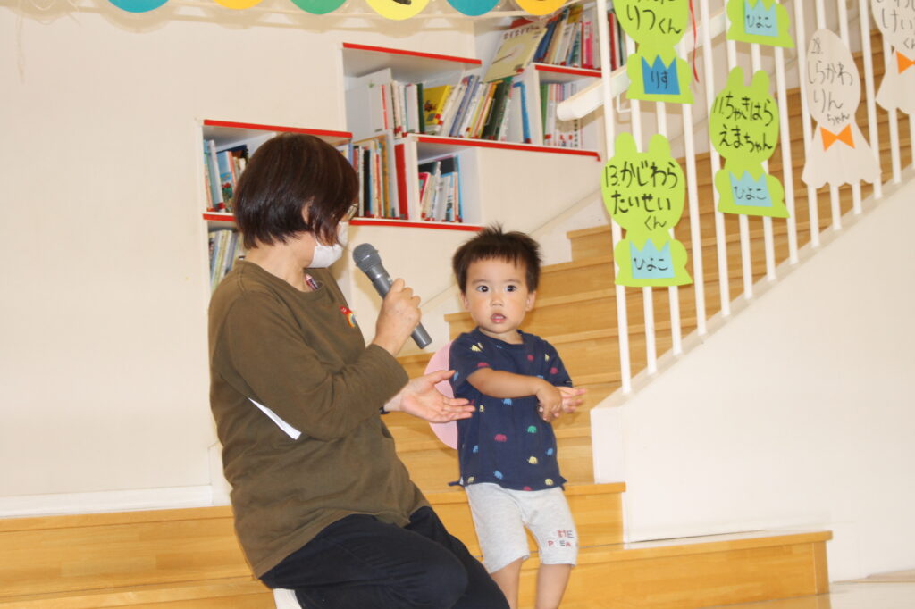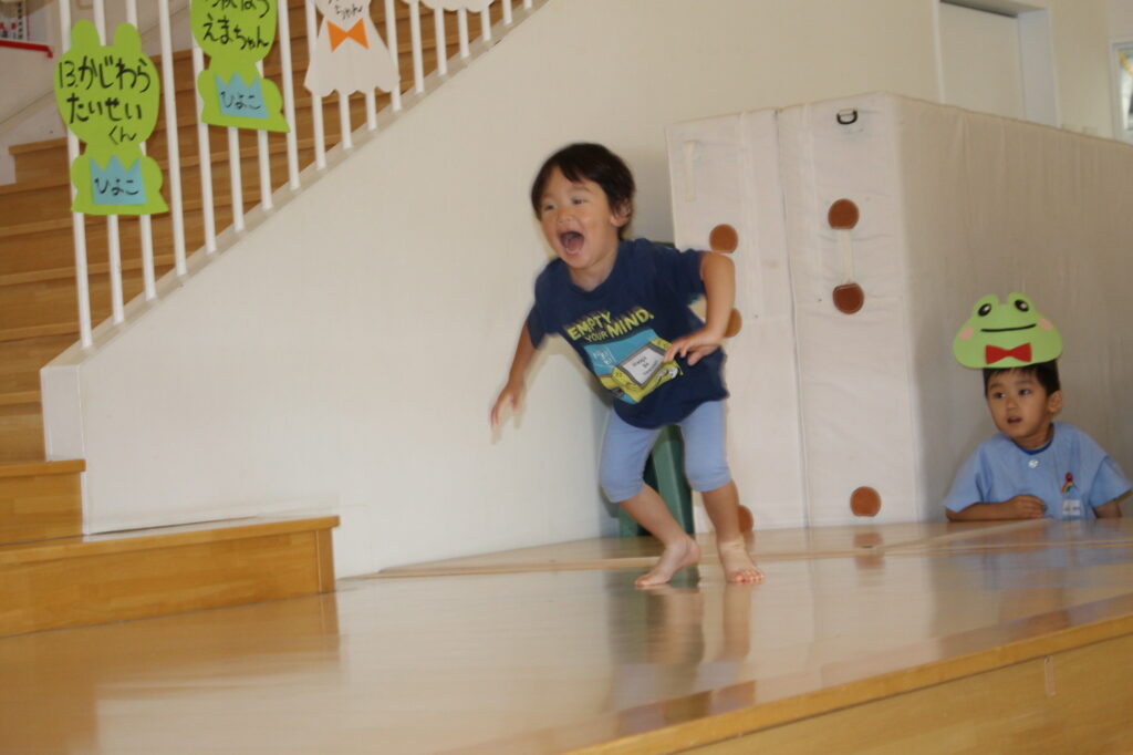 乳児組さんは「おたまじゃくし」になって、幼児組さんは「カエル」になって登場♪