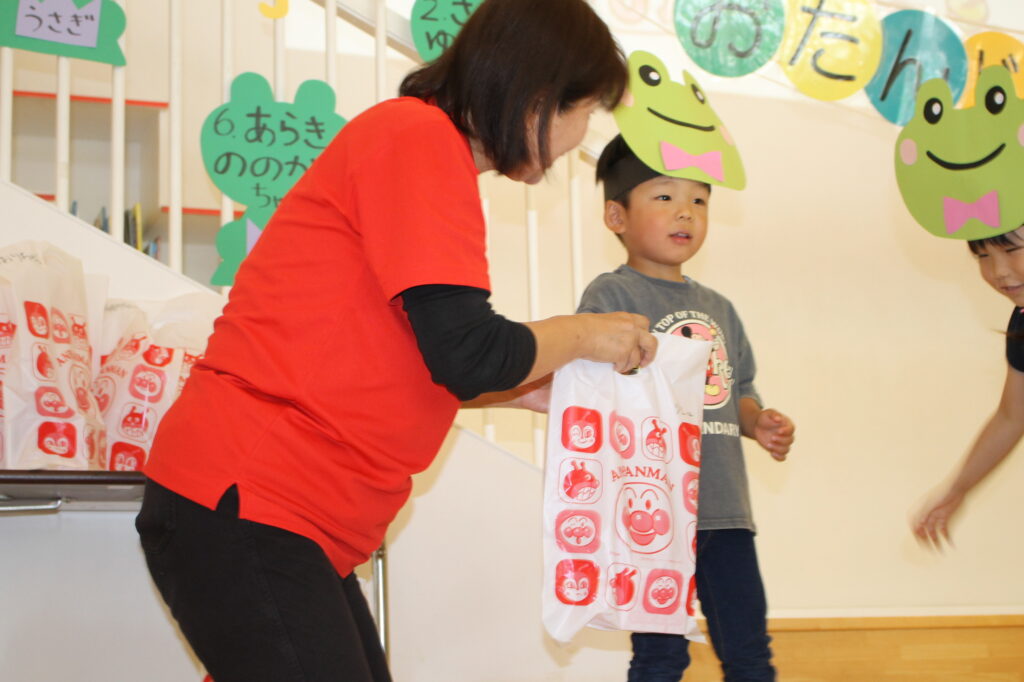 一人ずつ、おなまえや好きな色などをインタビューして、園長先生からプレゼントをもらいました。