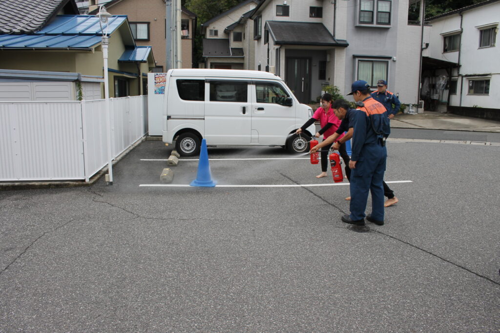 水消火器で先生たちが消火訓練を見せてくれました。