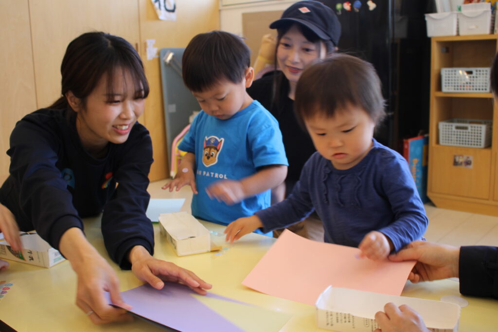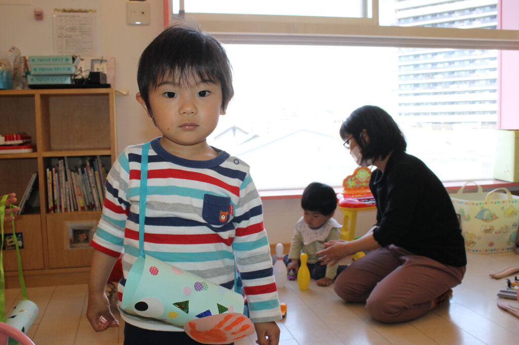4月24日(木)に予約の園庭開放が行われました。今月はふれあい遊びと「こいのぼりを作ろう!」で、6組のお友だちが遊びに来てくれました。