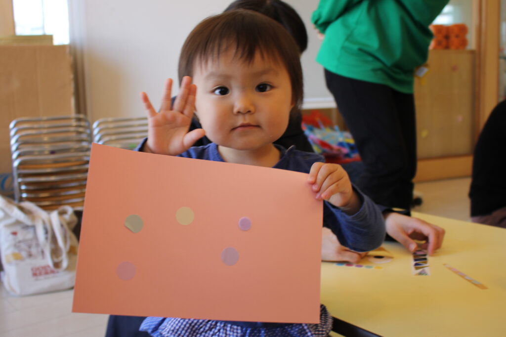 選んだ画用紙に今度は色々な形や色々な色、ぷっくりしたシールなど、可愛いシールがあり、違った素材のシールに合わせながら、集中してシール貼りに挑戦していました。