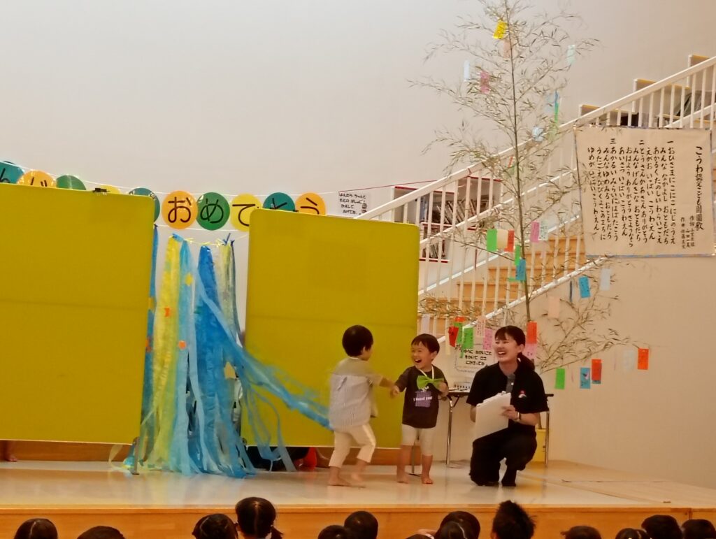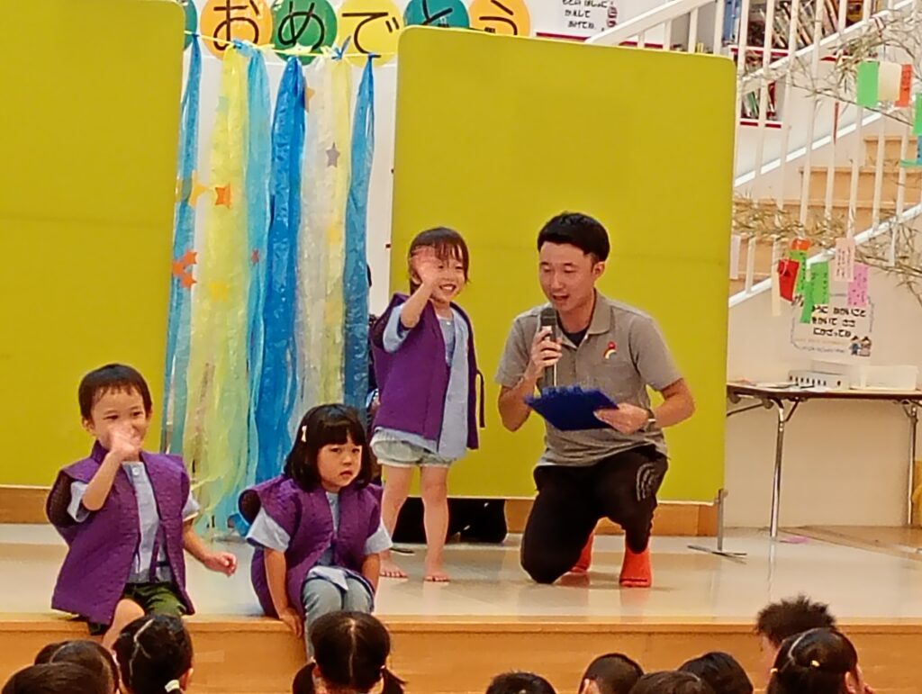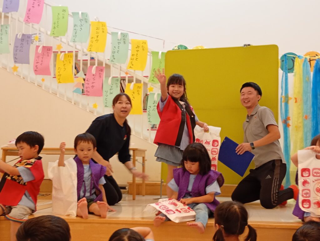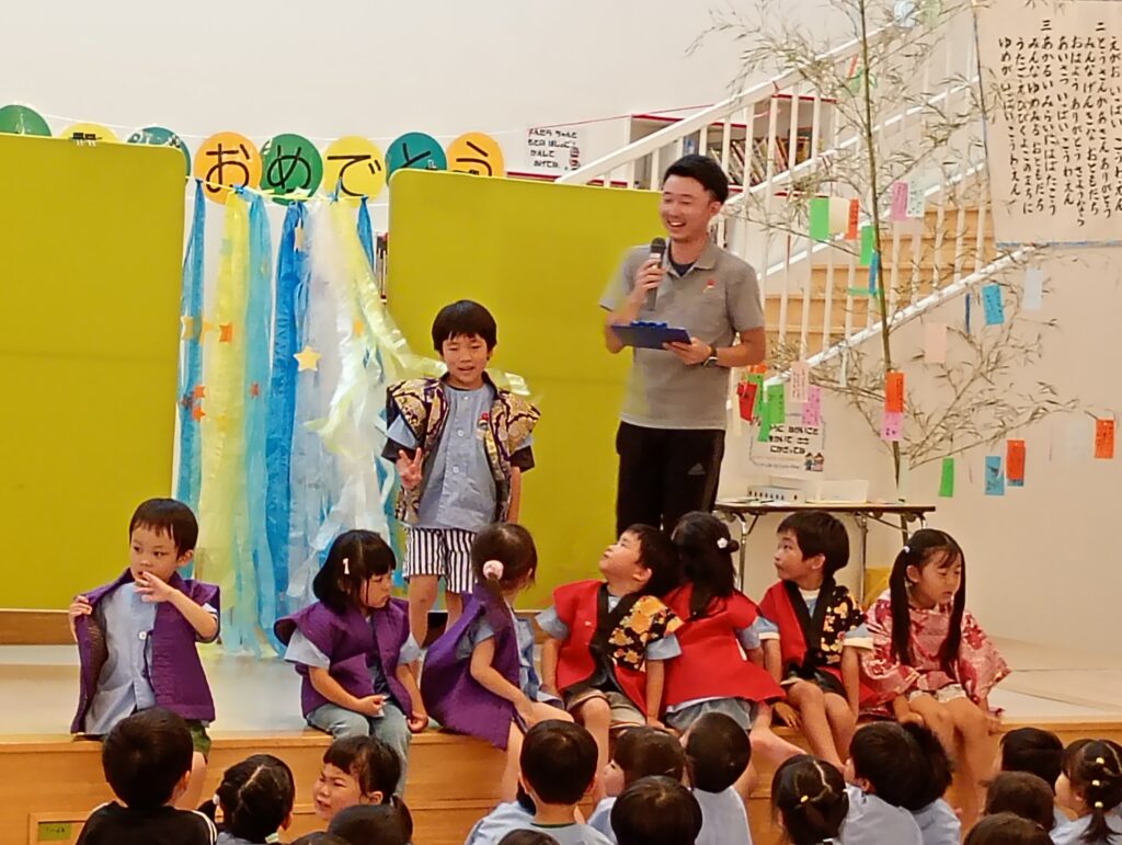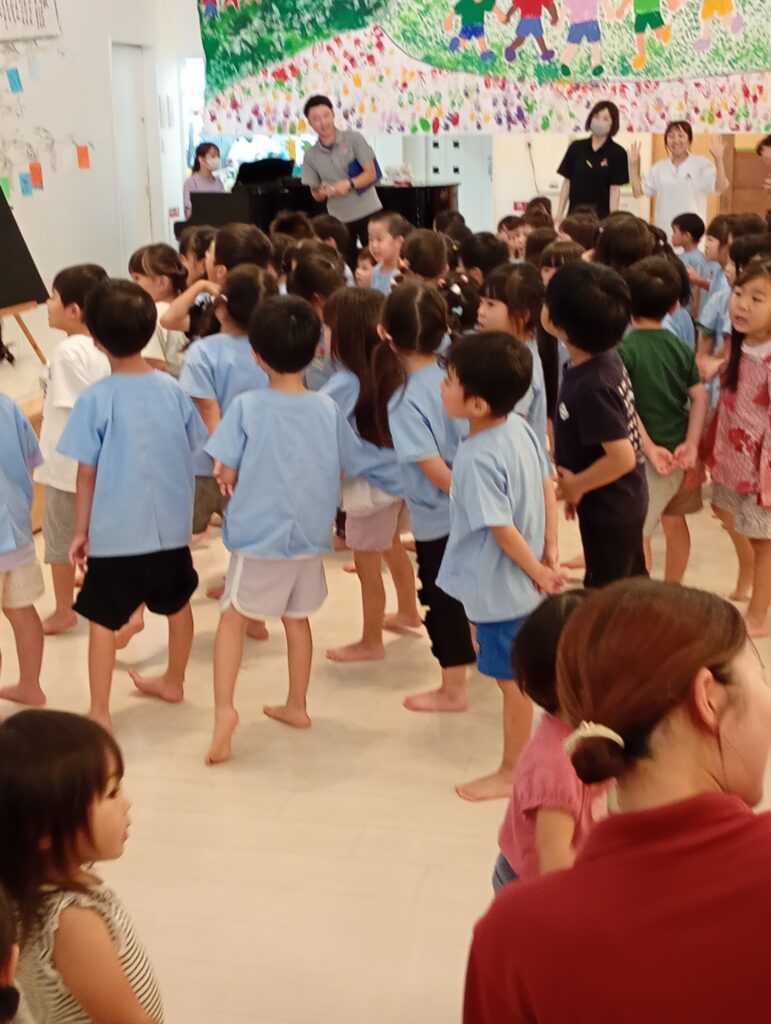7月7日(月)に7月生まれのお誕生日会と七夕会がありました。七夕の日ということもあり、ホールには笹やみんなの願いごとが飾られており、七夕の雰囲気いっぱいで始まりました。🎋