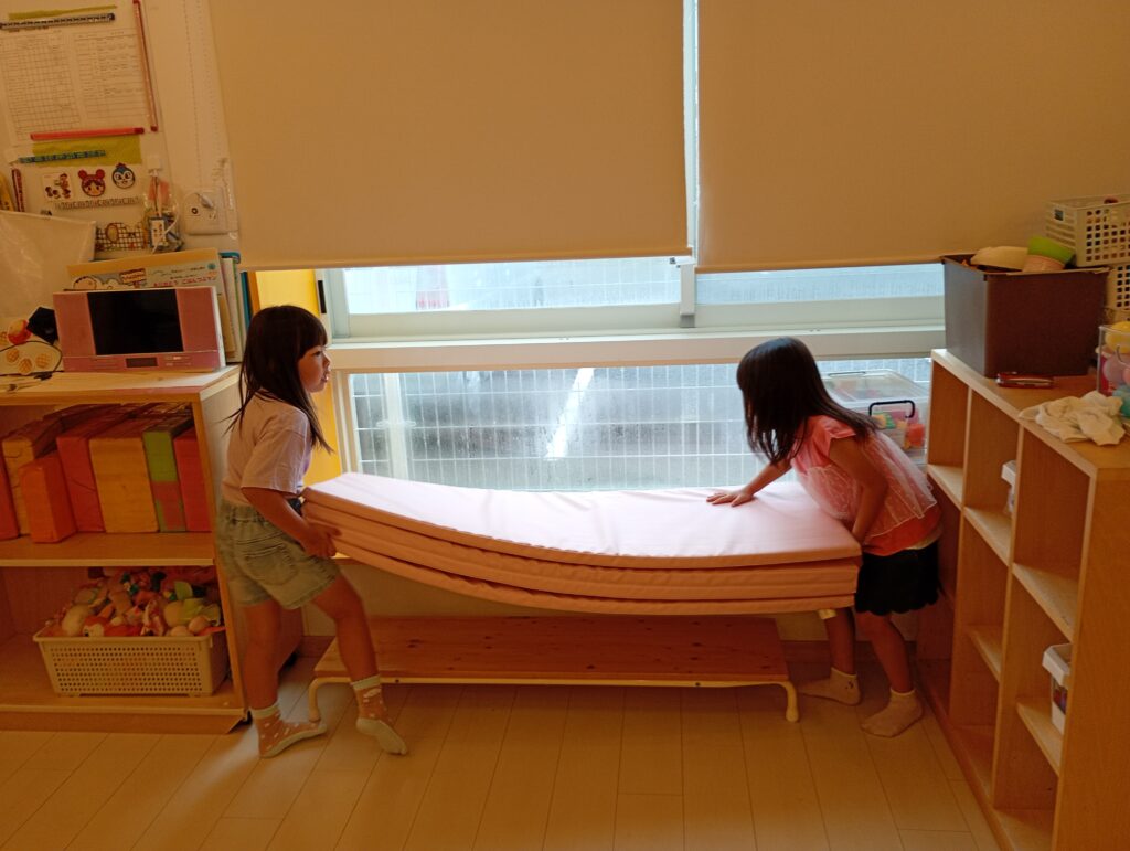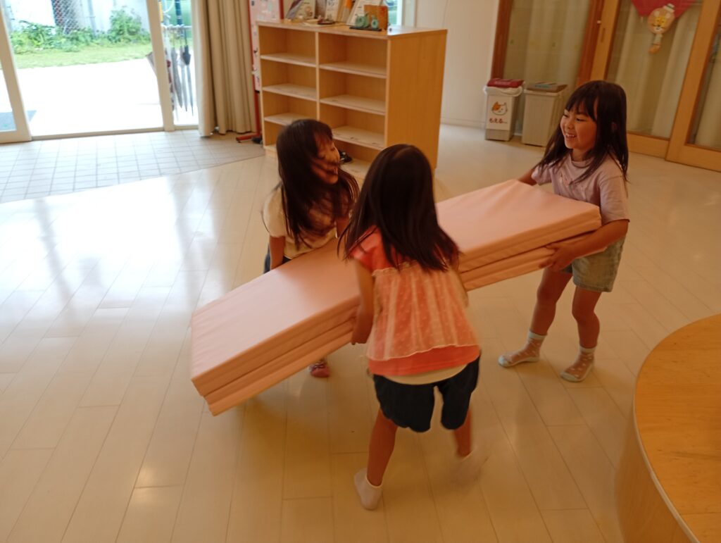 お布団係はうさぎ組さんに借りたマットを協力して運びました。
