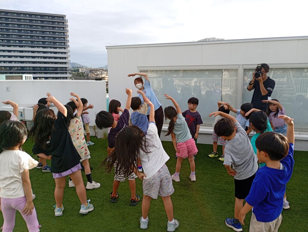 朝ご飯の前に屋上でラジオ体操、しっかり動いて目覚めもばっちり!!