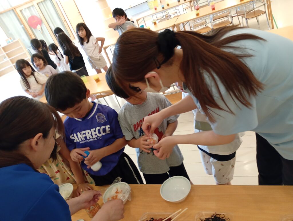 みんなは順番におむすびにの中に入れる具を選びます(*^▽^*)「梅にしようかなぁ?しゃけにしようかなぁ・・・・?」