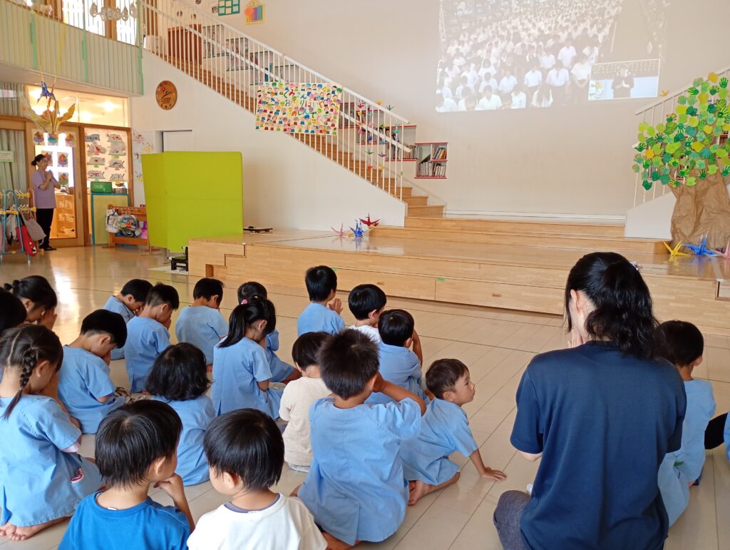 そして全園児が揃ったところで改めて、80年前の今日、沢山の方が亡くなられたことを祈りながらみんなで1分間の黙祷を・・・・。