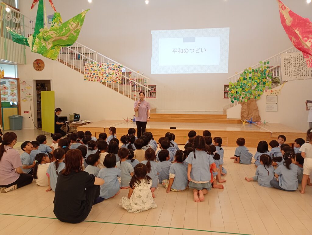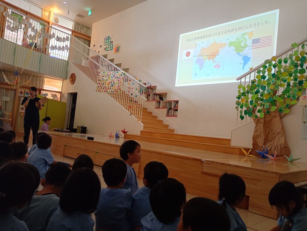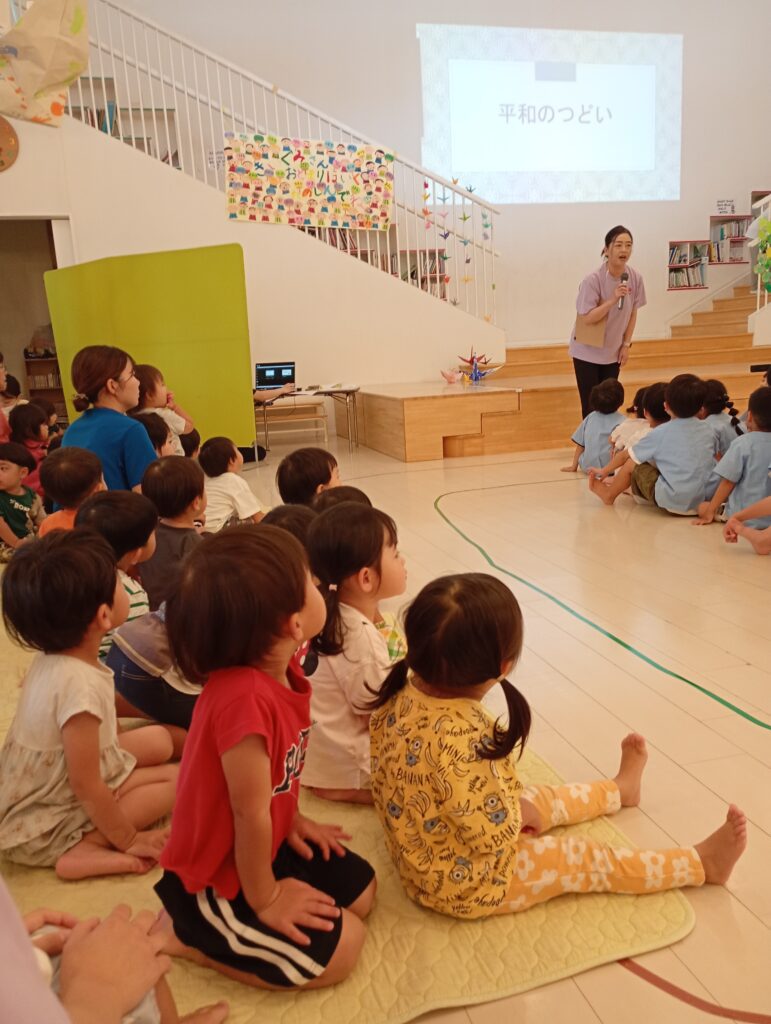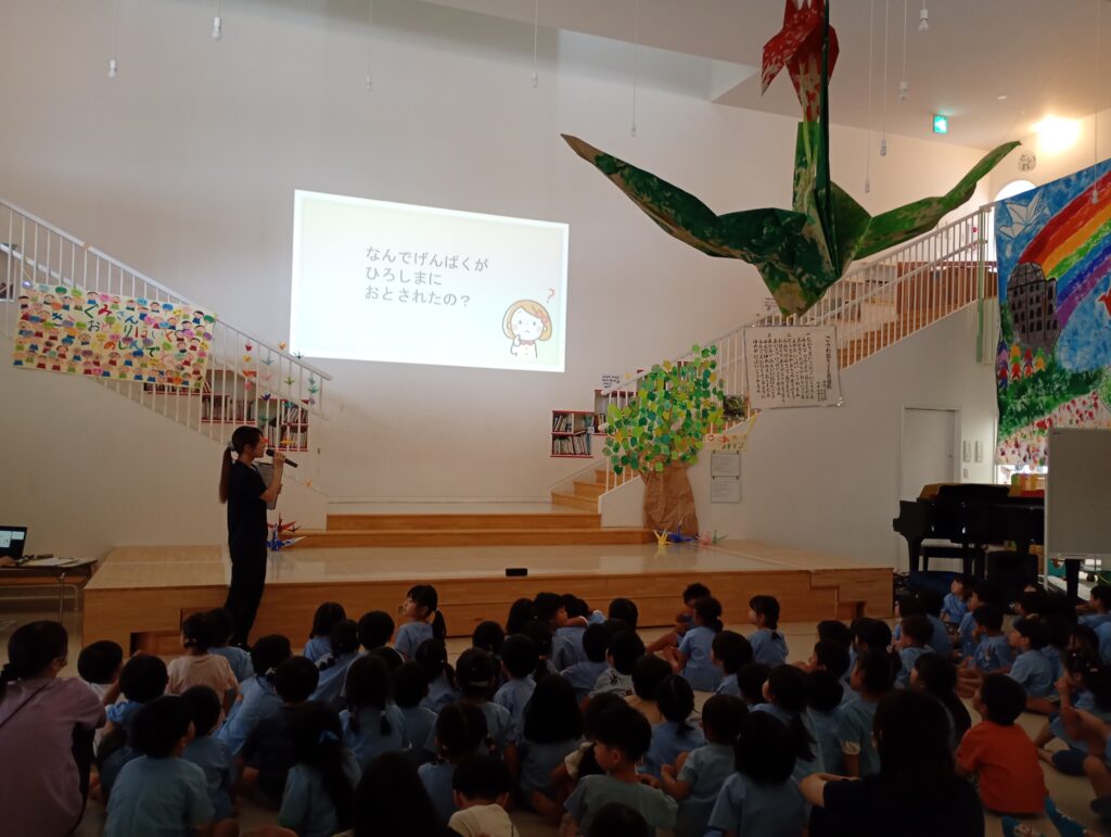 「アオギリのねがい」のお話のあとは、平和についてクイズを出しました。「なんで原爆が広島に落とされたの?」 この質問にすぐに答えてくれたのは年長組さん。「ケンカしたから?」 平和学習の中で話を聞いたり、みんなで意見したことを思い出し、戦争って怖いことなんだ・・・・と。