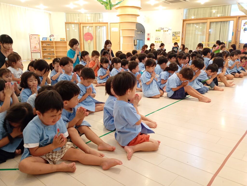 登園している子どもからホールに集まり、午前8時15分のサイレンと共に「安らかにお眠りください」と祈りながらみんなで黙とうをしました。
