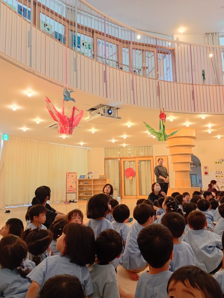 平和にちなみ、各学年が取り組んだこと、それは折り鶴が出来たらいいね!でした。小さいクラスから参加できる手形で大きな模造紙にペタペタ✋どの学年も綺麗に色付けしてくれたので、年長組さんがその紙を丁寧に折って折り鶴にしてくれました。ホールにたくさんの折り鶴が飾られると、とっても綺麗で心が和みました。✨✨