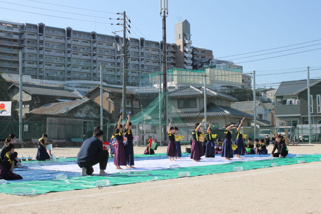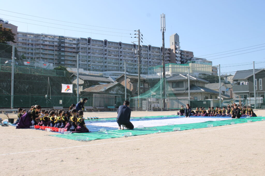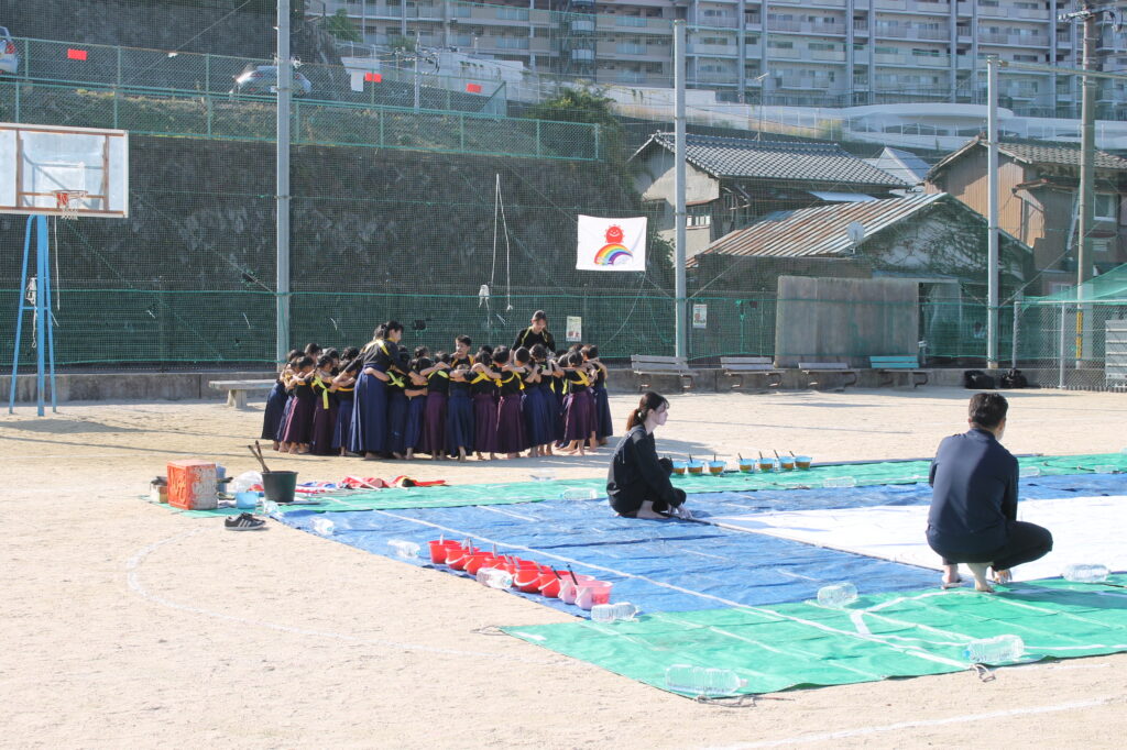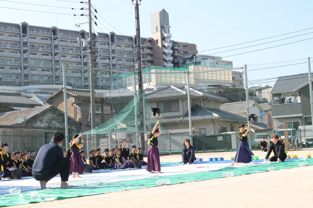 この書道パフォーマンスは自分の書きたいところや役割を子ども達の立候補で決め、子ども達が中心となって進めてきました。練習を始めた頃は楽しみ半分、不安半分だった子ども達でしたが、練習を進めていくうちに、筆の持ち方、動かし方など、自分なりに練習し探求した結果、自分なりに工夫し大きな筆を動かせるようになりました。