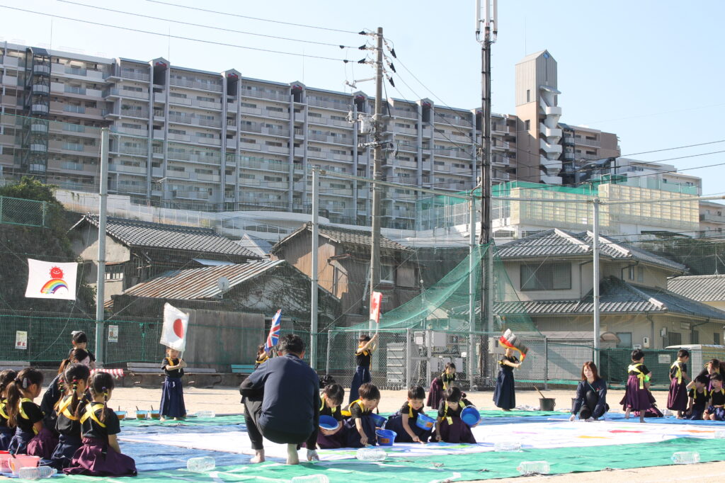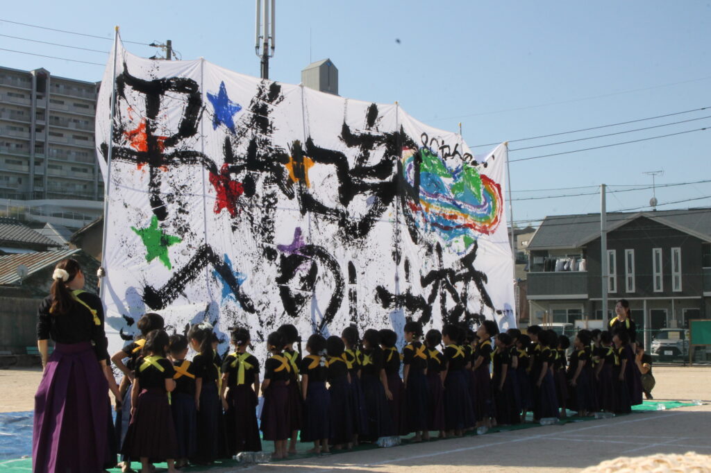 まずは年長組さんによる書道パフォーマンス。今年の運動会のテーマは「80年のちかい 平和への架け橋」