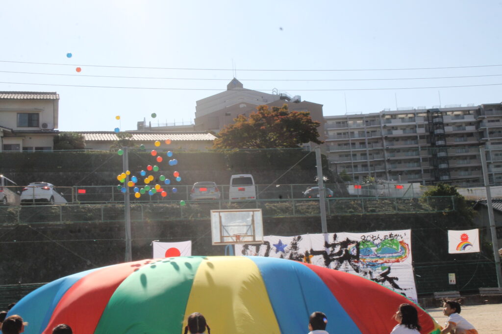 2グループに分かれそれぞれのチームが息を合わせながらバルーンを使って表現します。今日まで、沢山練習し、掛け声も息ぴったり!!