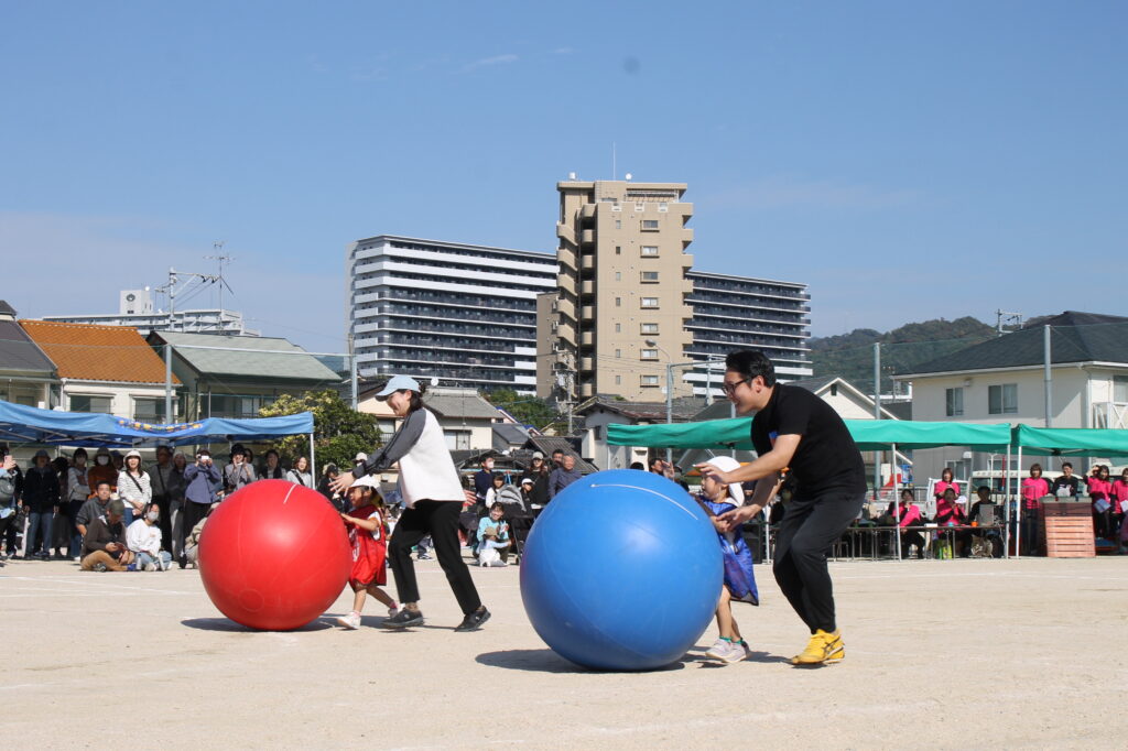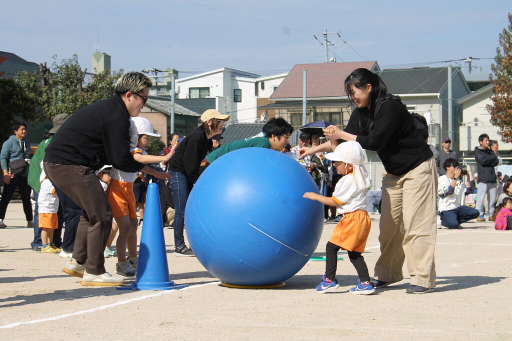 年少組さんの親子競技の大玉転がし「おむすびころりん」はお家のかたと一緒に大きな玉を転がすことが出来て、とってもうれしそうでした。