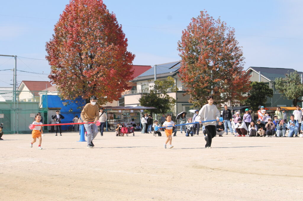 年中組さんの親子競技「あかぐみハリケーン」です。親子で力を合わせコースをぐるっと一回り。スピードも気持ちもひとつに最後まで頑張りました。