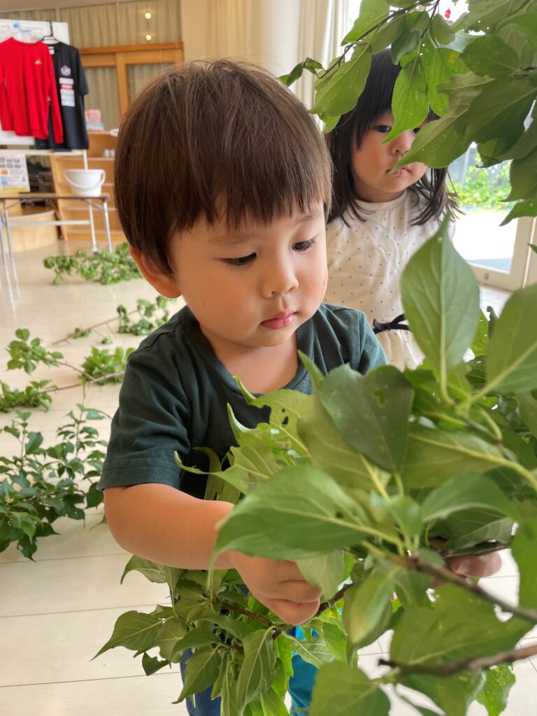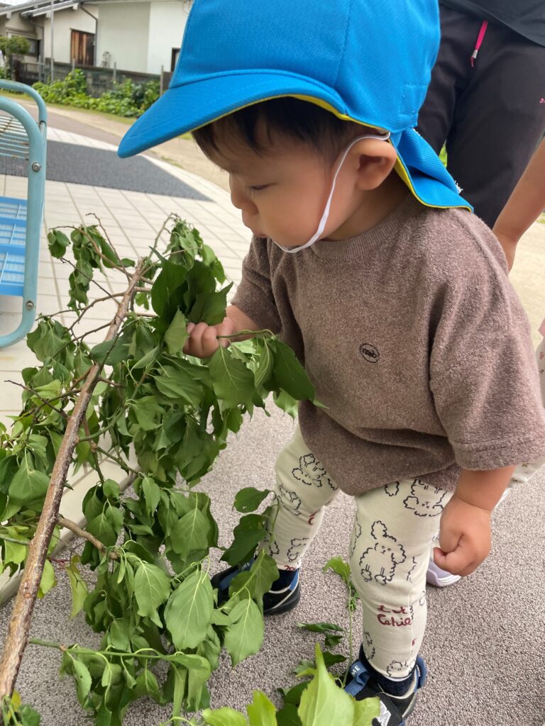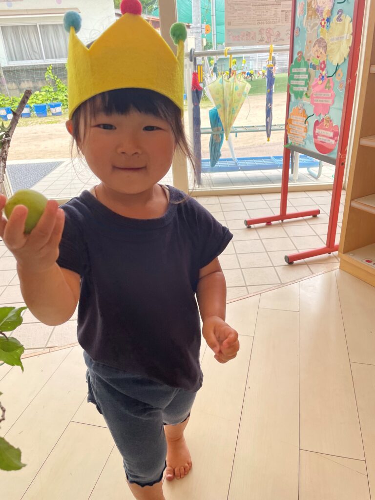 葉っぱに隠れている梅を見つけてとってもうれしそうにしていました。