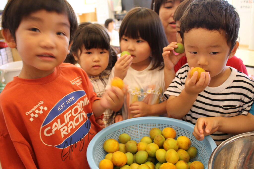 まずは、梅もぎを乳児クラスさんがしました。