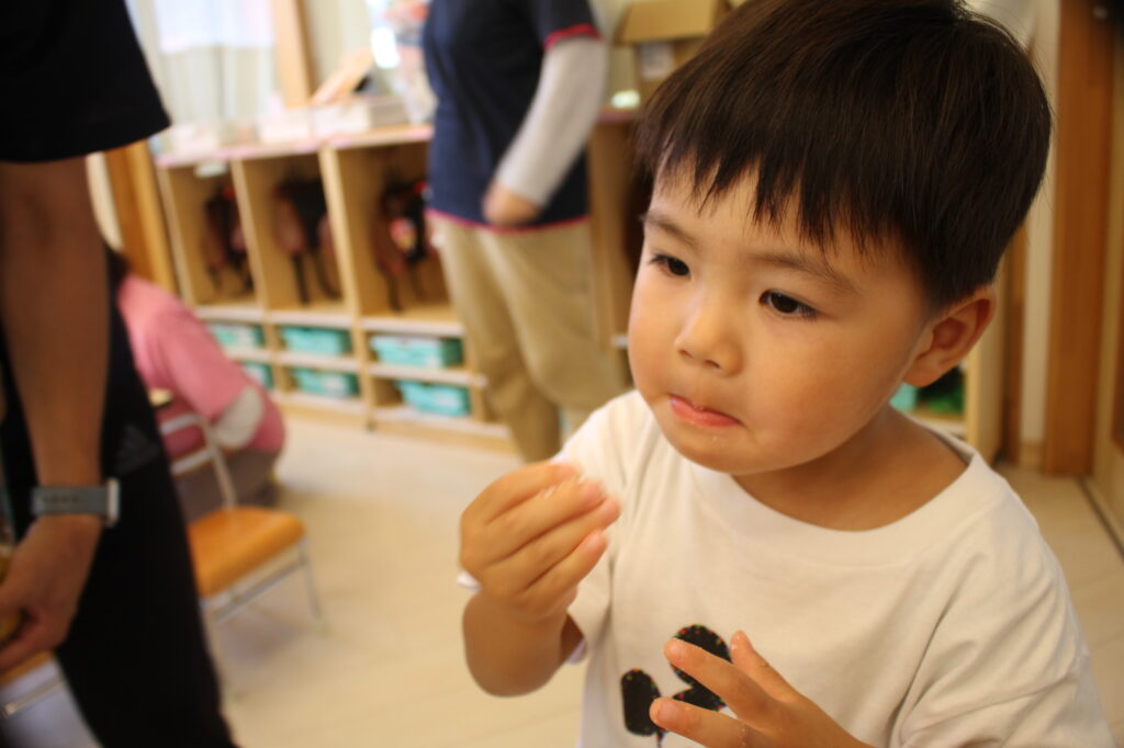 手についた塩をぺろっとなめて「しょっぱーい!」と。
