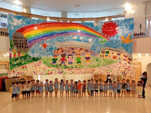そして全園児が揃ったところで改めて、80年前の今日、沢山の方が亡くなられたことを祈りながらみんなで1分間の黙祷を・・・・。