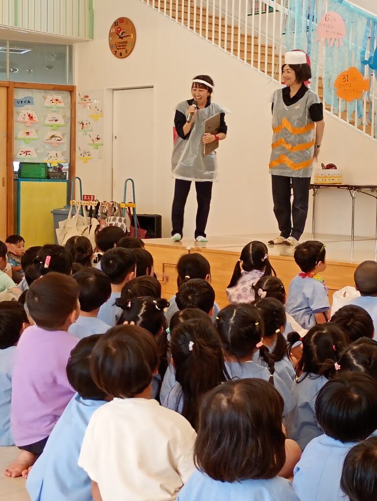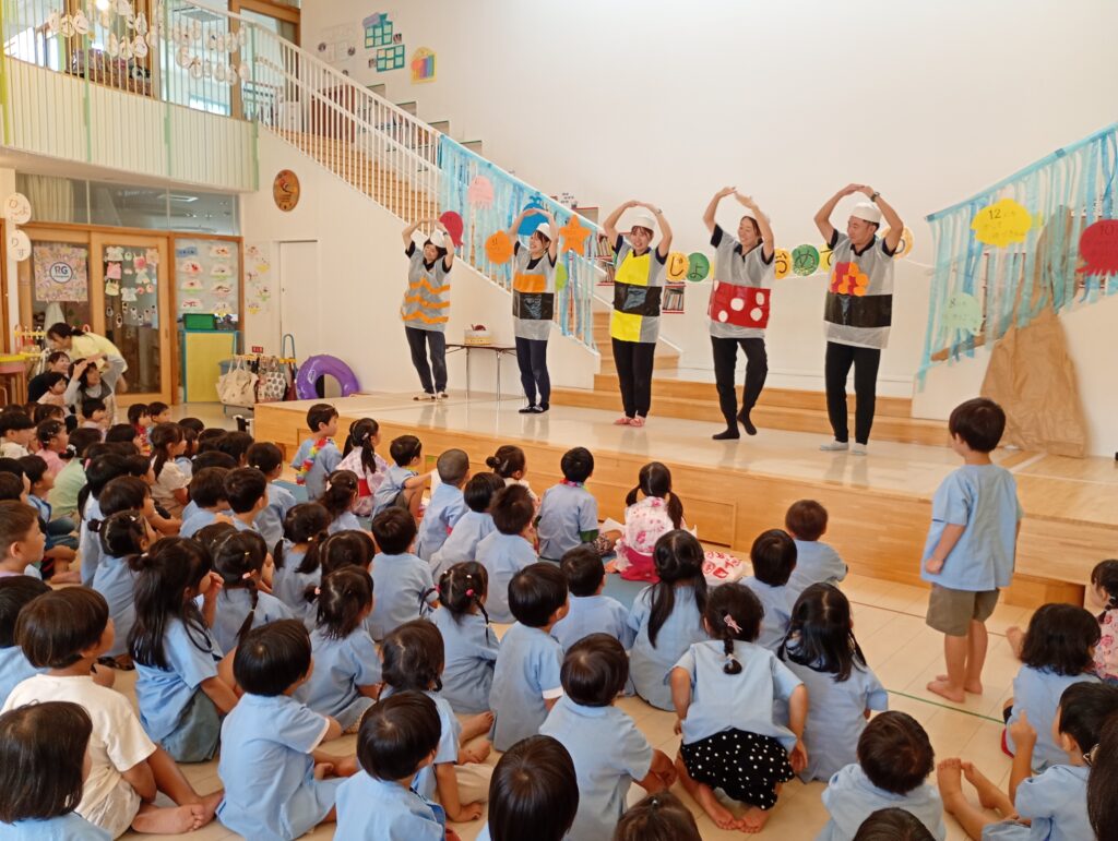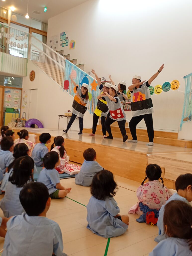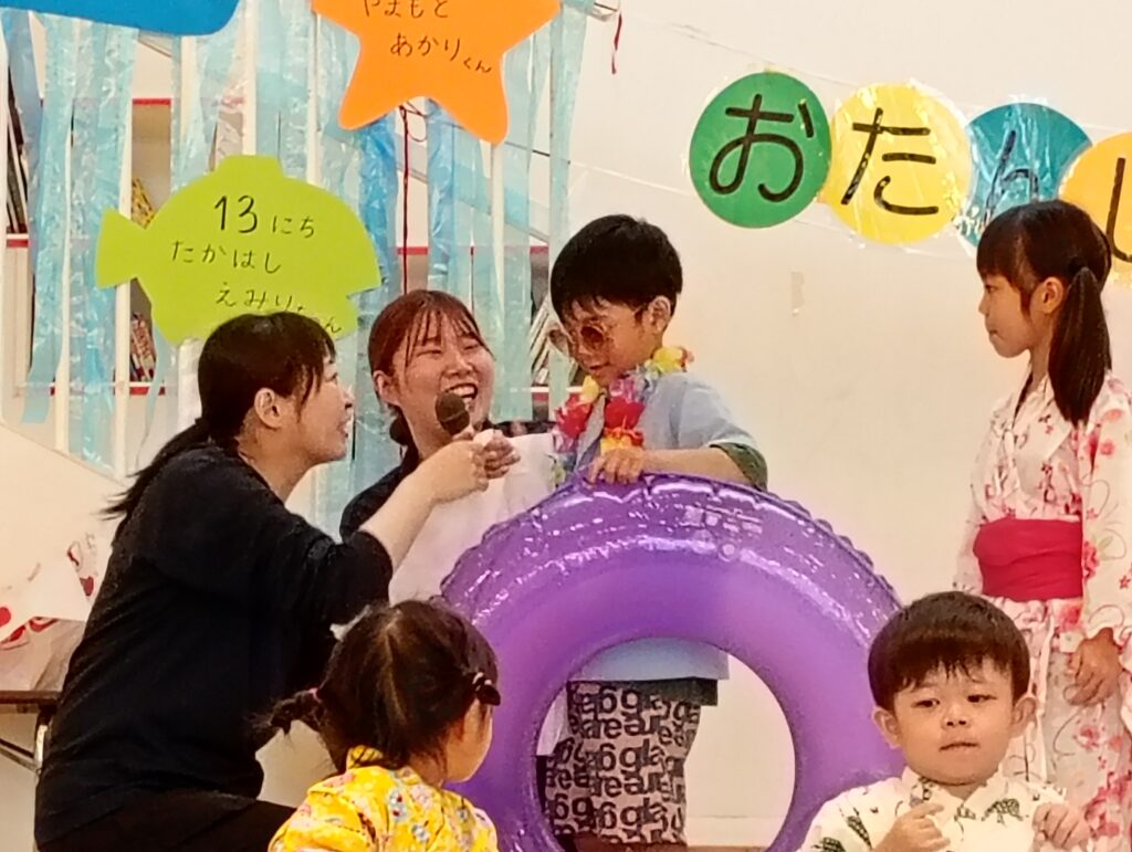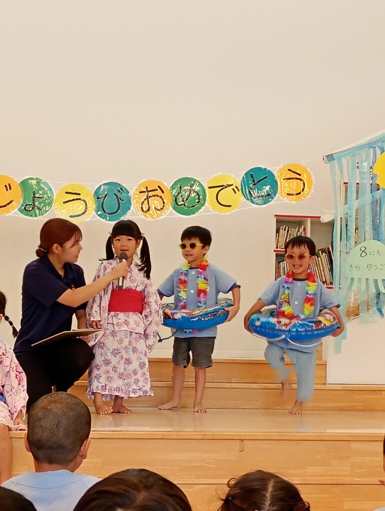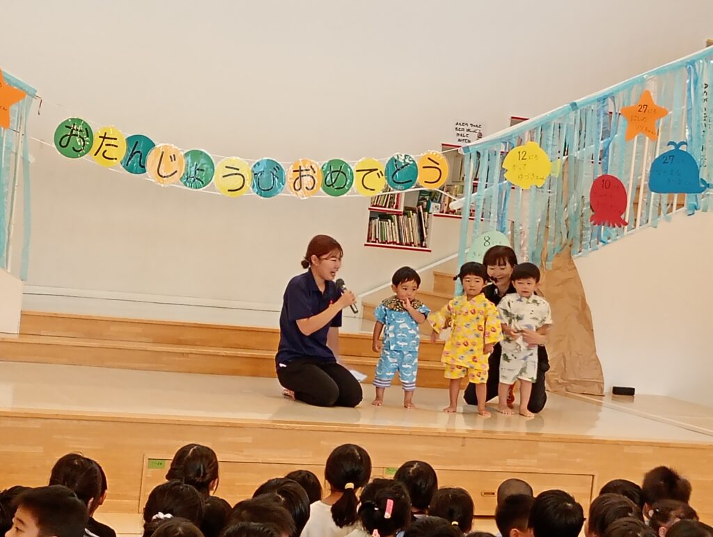 8月27日(水)に8月のお誕生日会がホールで行われました。(*^▽^*)お誕生日のお友だちは浴衣や甚平を着て夏らしく登場!!