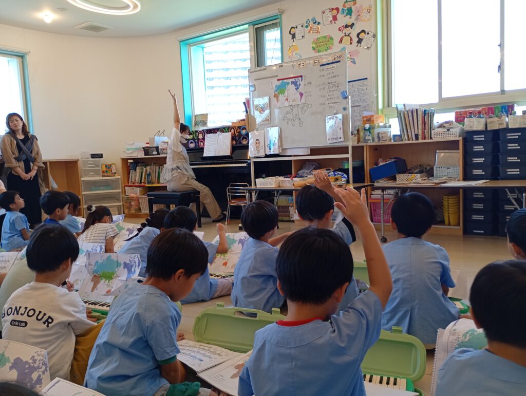 後半では、世界地図をみながら、世界の国で作られた童謡を当てるクイズをしました。・・・・・ピアノのメロディを聴くとすぐにわかったようで、「ハイ!」と手を挙げしっかりとどこの国の童謡かを当てていました。👏👏( ;∀;)
