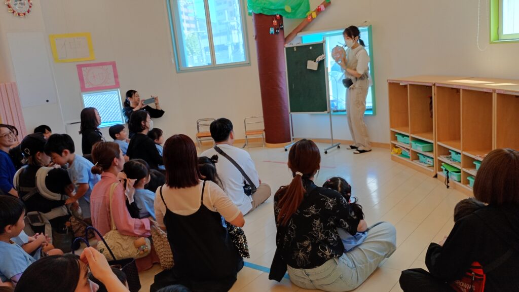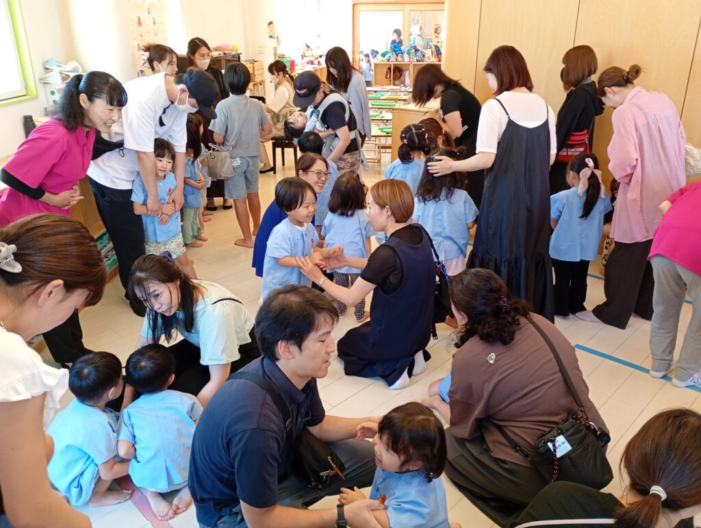年中組さんは・・・・・たくさんお家の方が来られている中、しっかり先生のお話を聞いています。大好きな歌を聴いてもらった後は、