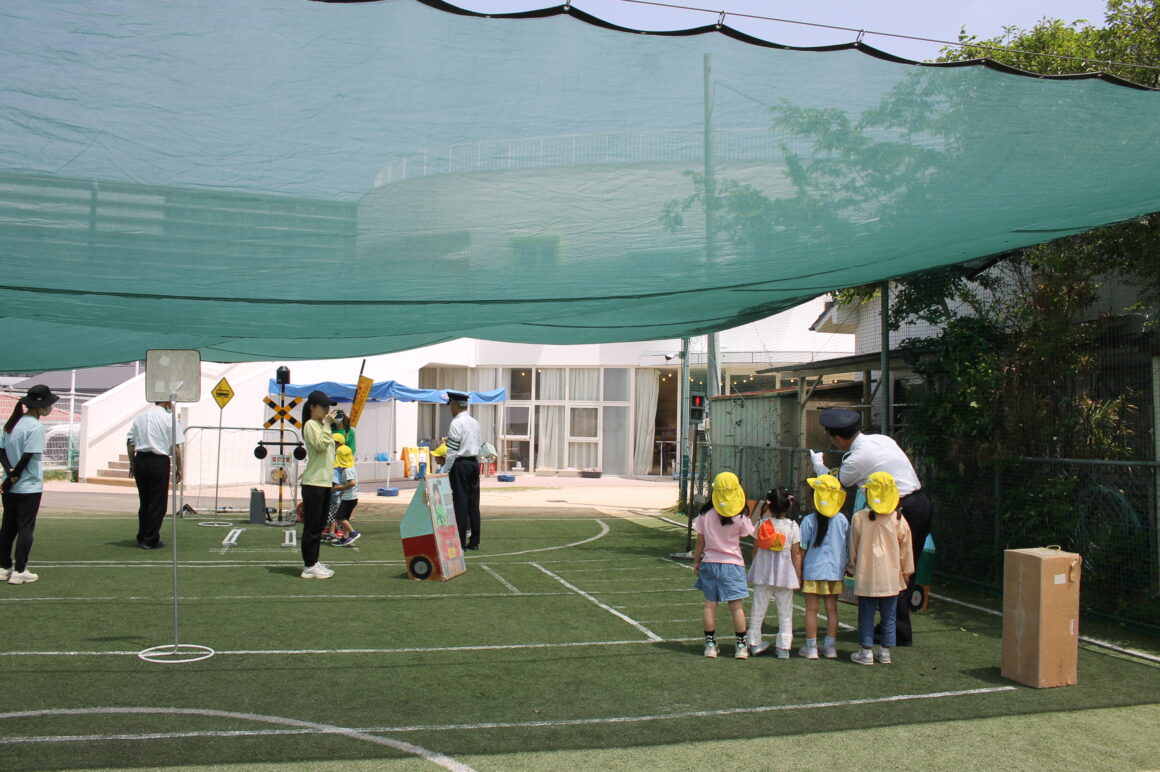 5月19日(月)に交通安全教室があり道路管理課の方が来園され、 年長組さんと年中組さんがホールに集まり交通安…