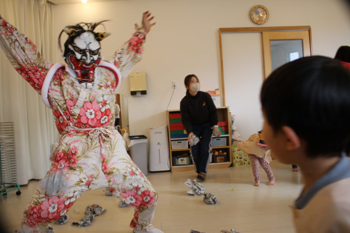 2月2日に節分を行いました。 各クラスで節分の由来を聞き、「もし鬼が来たら・・・」を考えて、新聞紙で豆を作り…