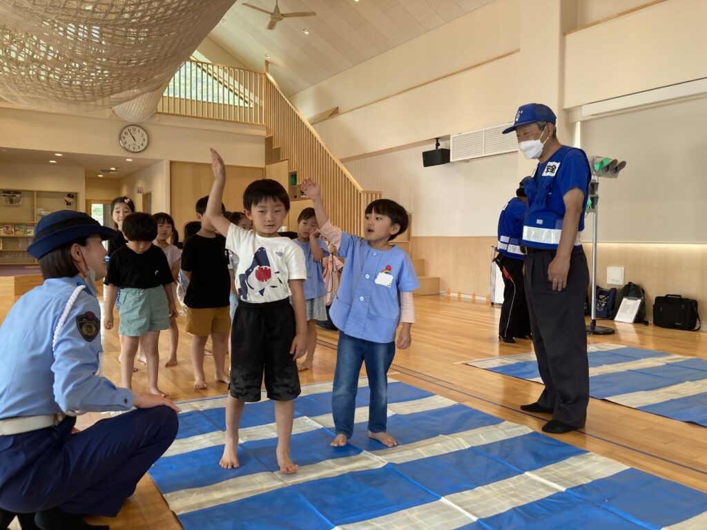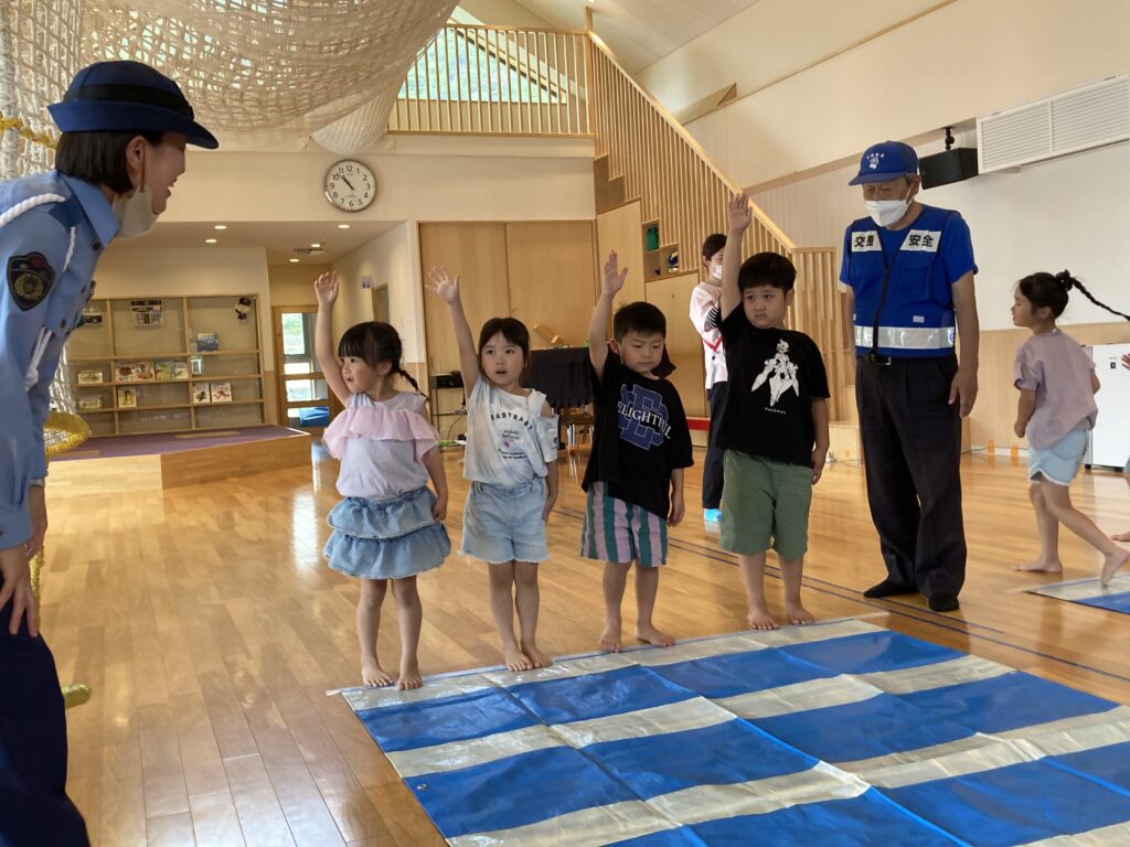 交通安全教室の中で、お話をよく聞いて、「止まる・見る・手を挙げる」をしっかり練習!