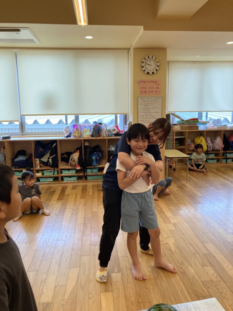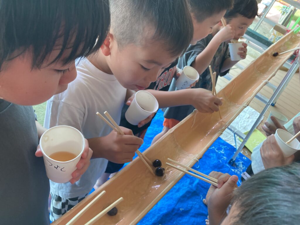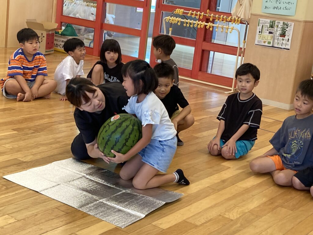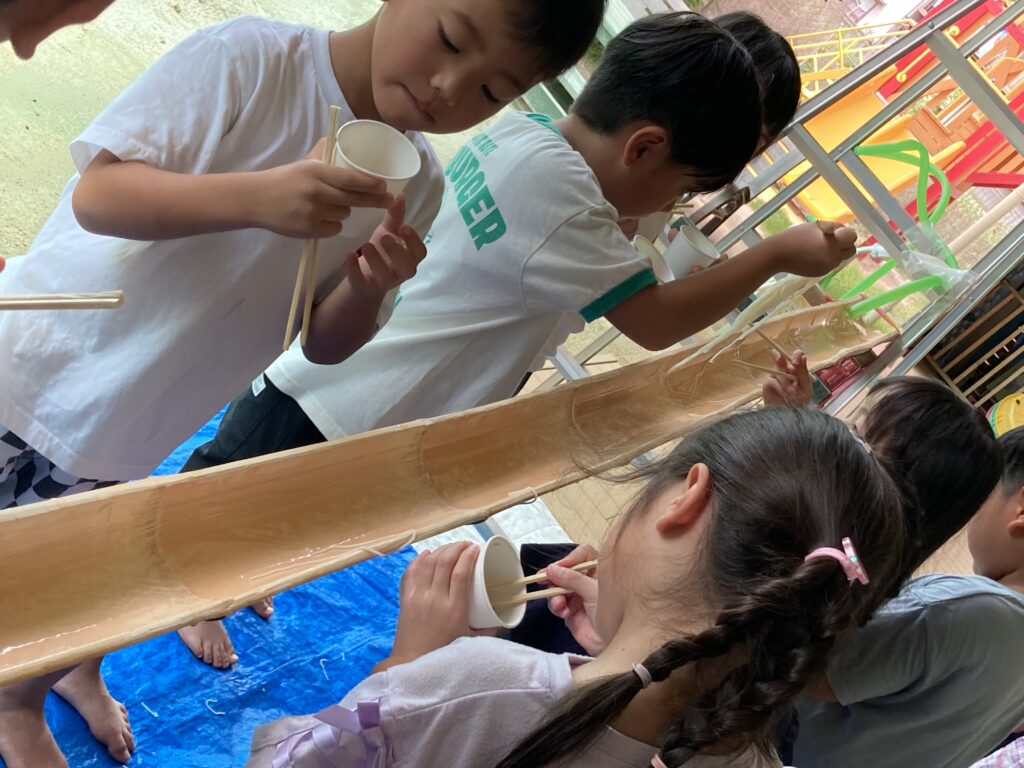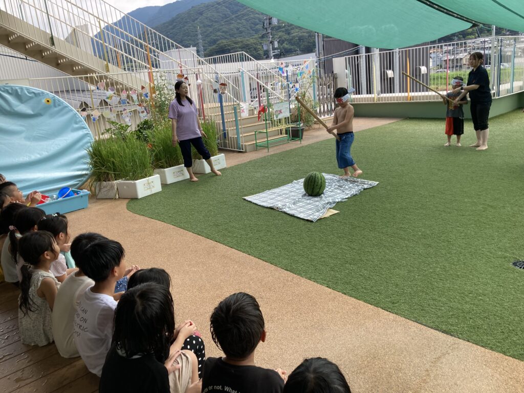 スイカの重さ当てクイズ、水遊び、集合写真、スイカ割り、流しそうめん(お腹すいたー!の声があちこちから♪)、デザートのスイカ…等など、盛りだくさん(*^^*)!!