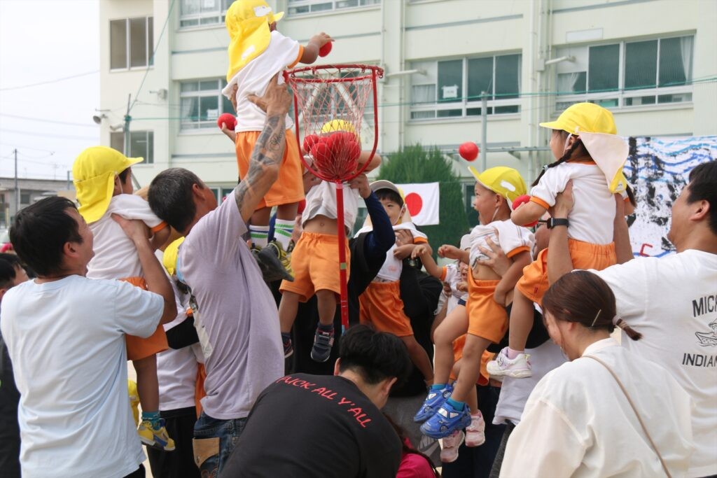 お父さんの肩車から籠に玉を“ひょいひょい”と入れる姿も見られ、大盛り上がり(*^^*)