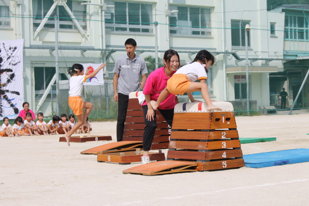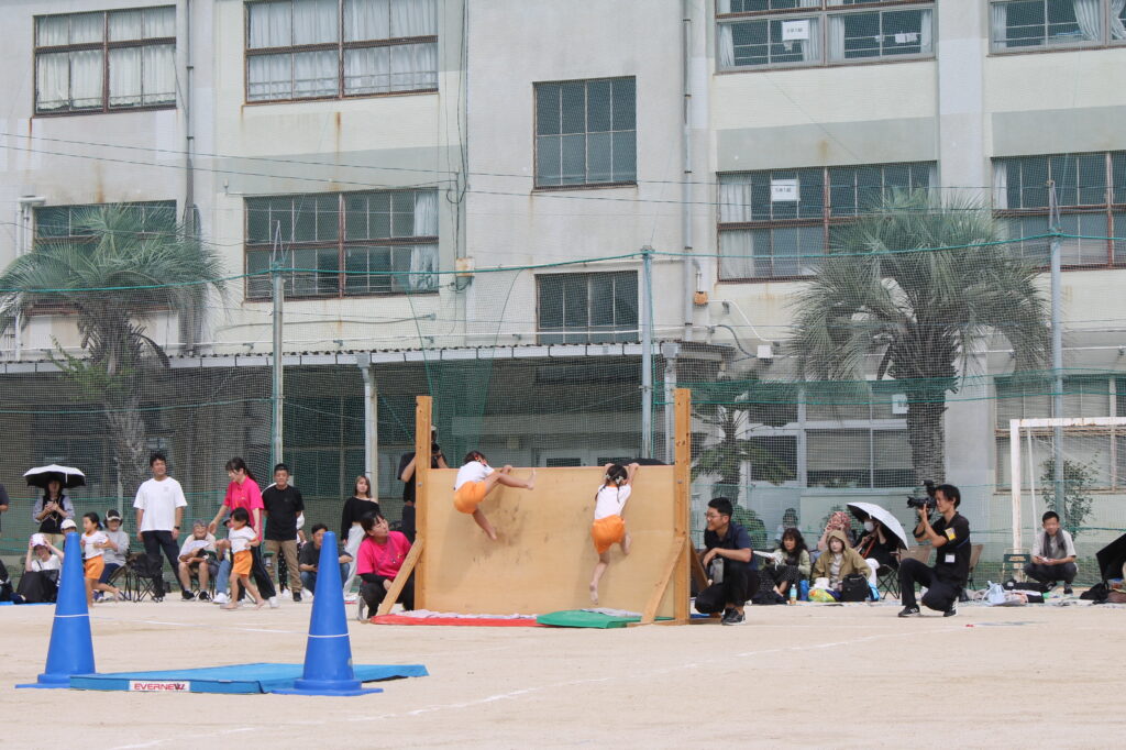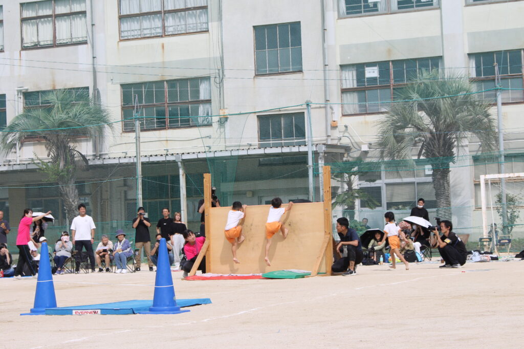 跳び箱からマットでの側転、そして壁登りへ。