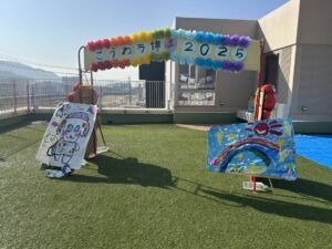 玄関には、7月に全園児で制作したキッズゲルニカを掲示し、迫力ある作品で来園された皆さまをお迎えしました!