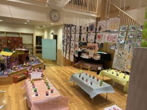 3階ホールに、0歳児から5歳児まで、全園児の作品を展示し、作品展を行いました。