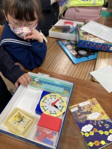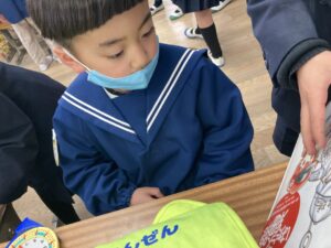 交流の中では、こうわの子どもたちから1年生へ質問タイムもあり、学校で使う色々な道具を紹介してもらったり、体験させてもらったり…。