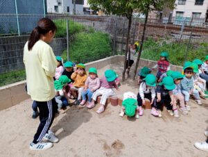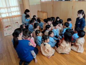 突然鳴る警報音に驚く姿も見られましたが、保育者の声掛けを聞きながら、落ち着いて過ごす子どもたちの姿がありました。