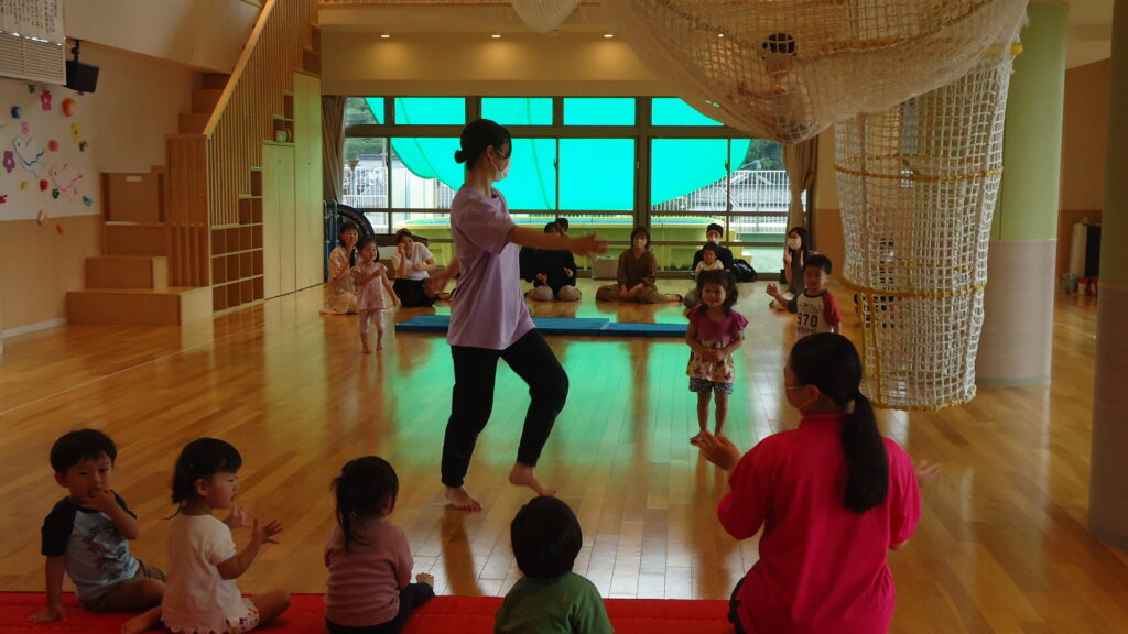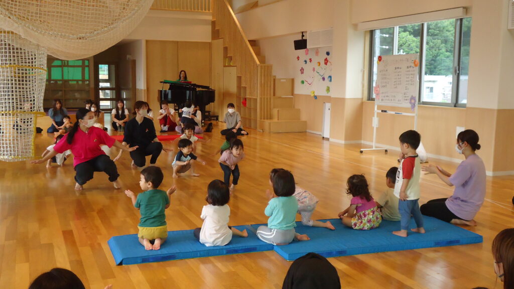 2歳児クラスは広いホールでリズム遊びをしました。いつもしているリズムをお家の人に見てもらえると、メダカやトンボ、アヒルをとっても上手にする事が出来、いっぱい拍手をもらいました👏さすが、うさぎ組さんですね(^_-)-☆
