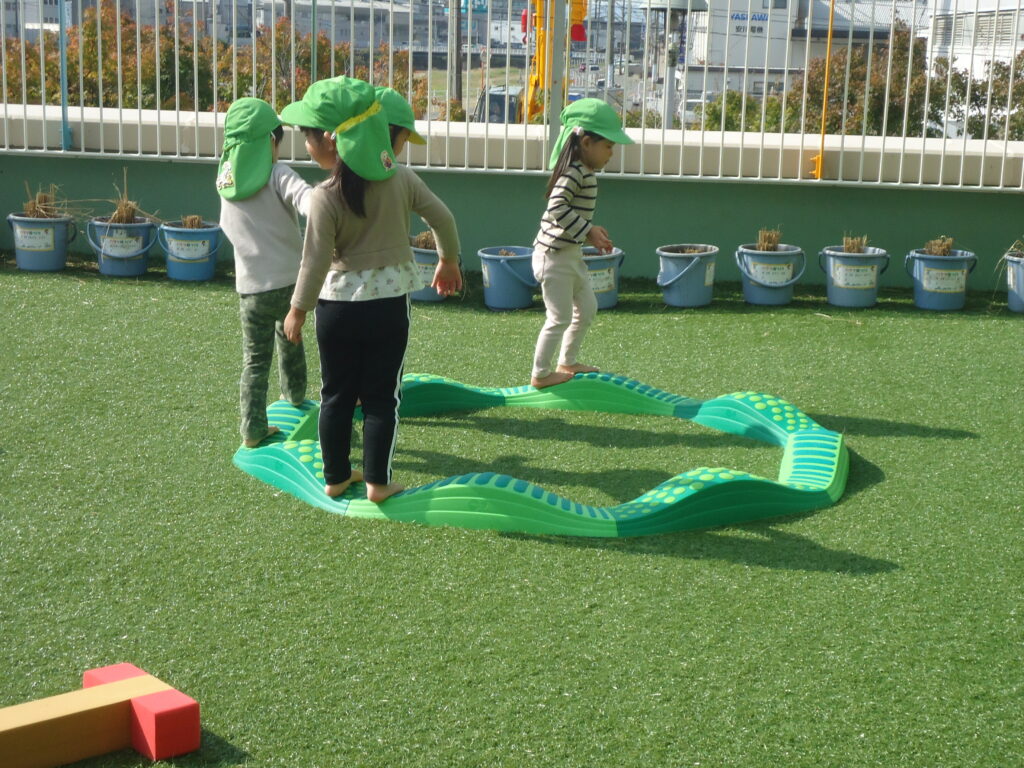 2歳児のお友だちが遊びにきてくれたので、まずはでこぼこした道のウエイブバランスを上手に歩く様子を見せてもらいました。