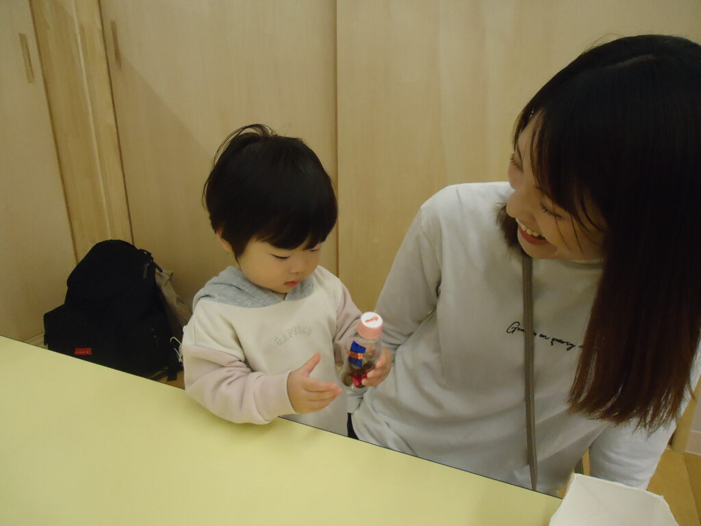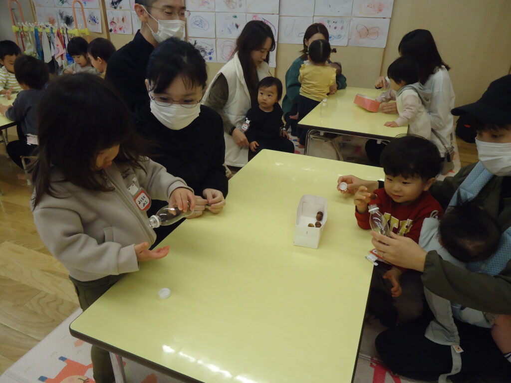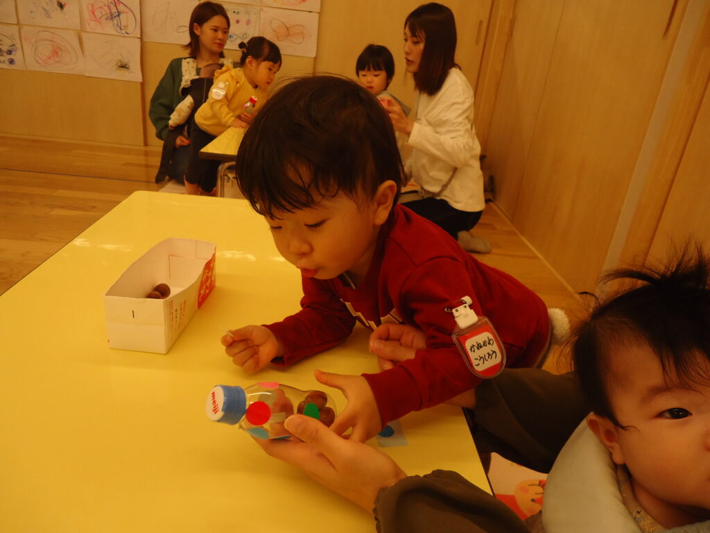 マラカス作りが始まりました・・・・✨✨説明をよ~く聞いてくれていたようで、制作が始まるとどんぐりを指先で持ちぽとん。