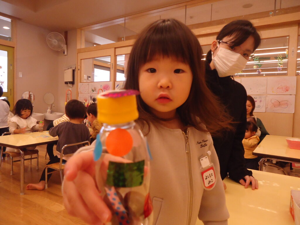 「見てみて~~~!!」と自分で作った素敵なマラカスをカメラの前でしっかり見せてくれましたよ。みんな、自分で作ったマラカスを大事そうに持っていました。(*^▽^*) みんなのマラカスが出来ると、マラカスのお披露目会(笑)