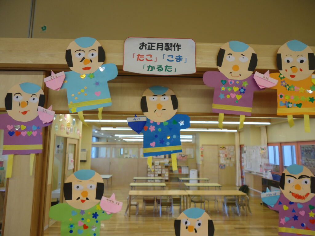そしてお正月制作では、凧やコマを作りました。手先を使い、上手に凧の模様や顔の表情を作り、年中さんならではのおもしろさですね。元気いっぱいの子ども達が目に浮かびます。